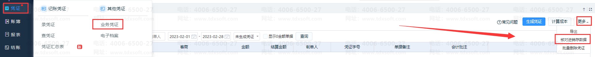 1、点击【凭证】-【业务凭证】-【更多】-【核对进销存数据】,查看核对总表;
