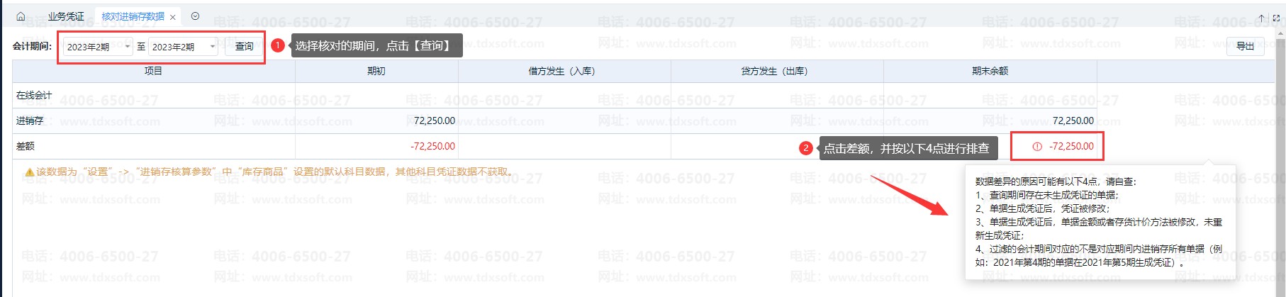 ①查询期间存在未生成凭证的单据;