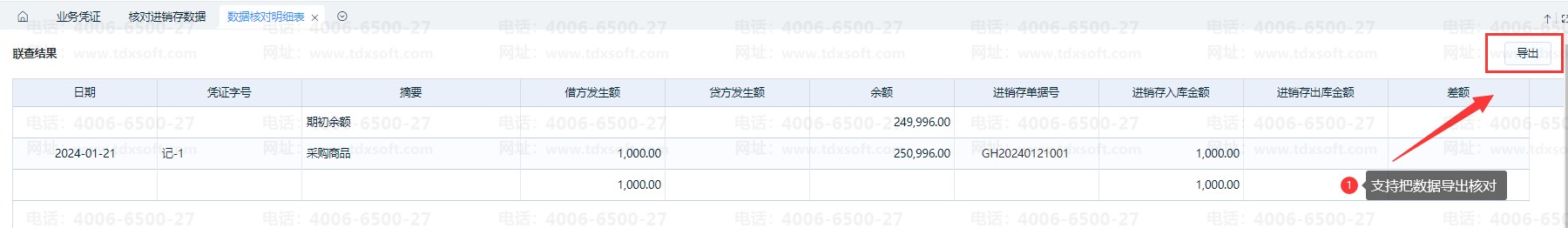 3、点击“差额”可以联查到查询会计期间的明细,找出存在差额原因。点击“凭证字号”可以链接凭证,点击“进销存单据号”可以显示凭证对应所有单据列表。另外,也支持把数据导出EXCEL进行核对。