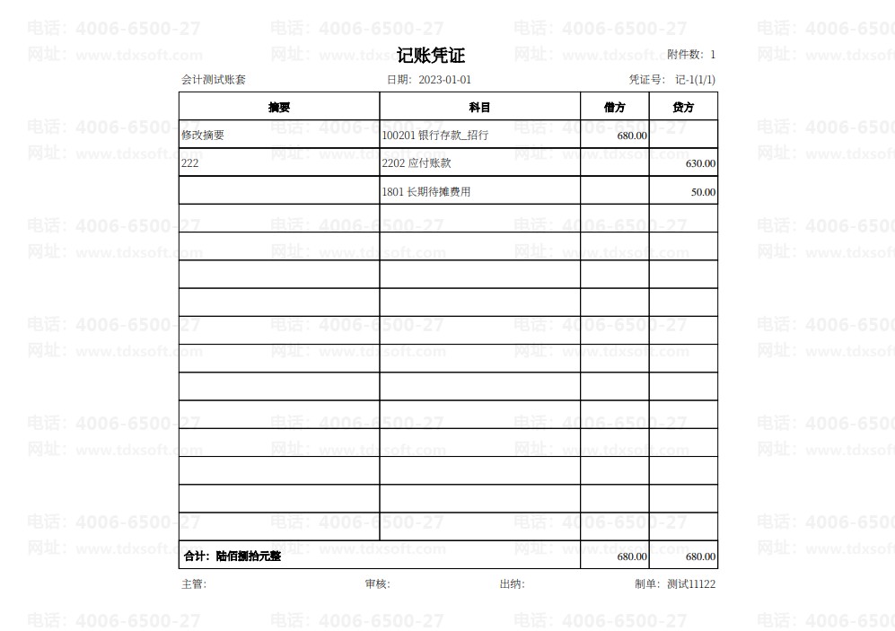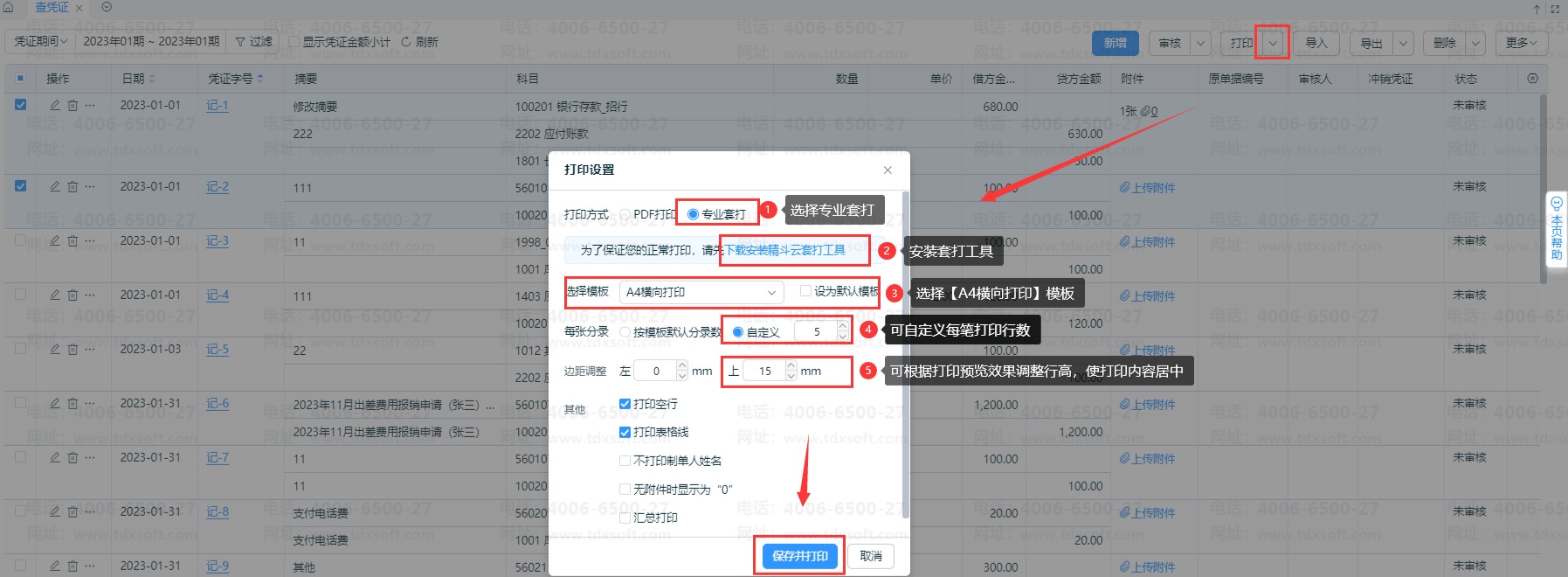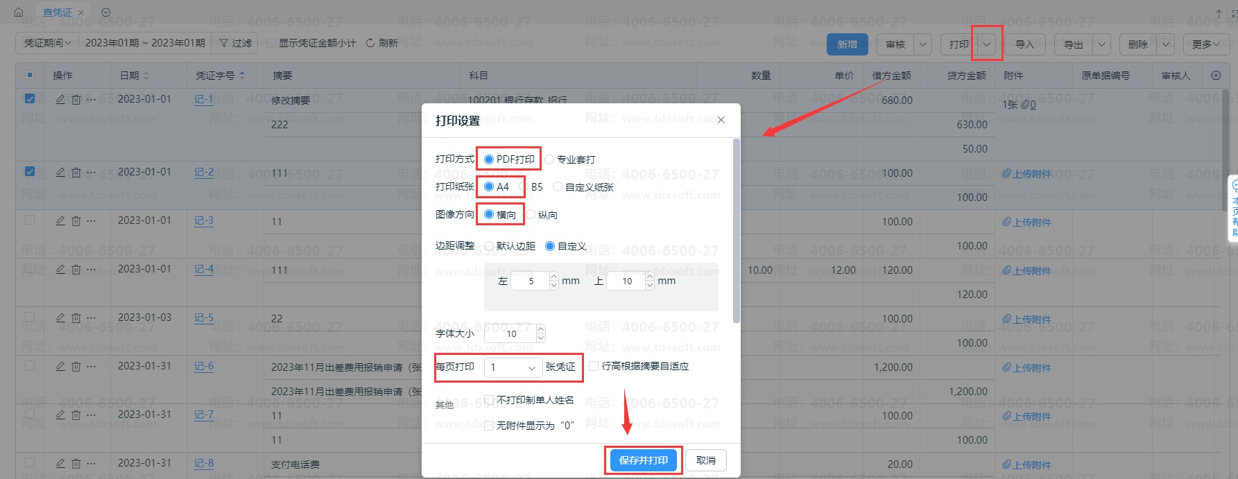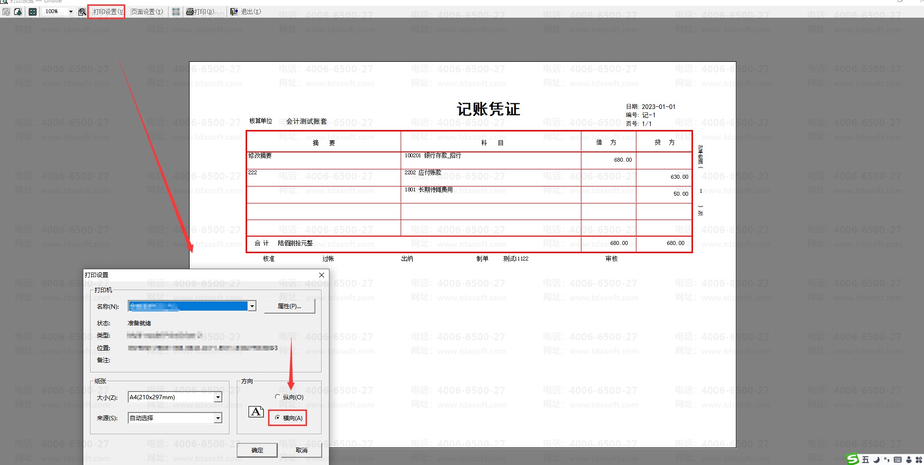 使用A4纸打印一张凭证,系统有2种打印方式,可以选择PDF横向打印和专业套打横向打印