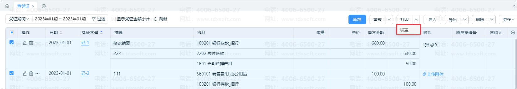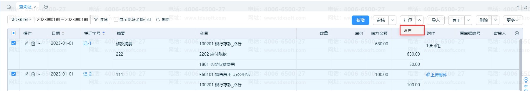 在【查凭证】选择打印的凭证,点击【打印】下拉箭头,点击【设置】