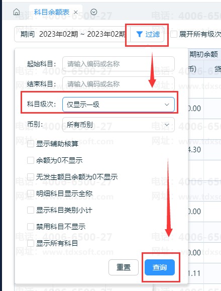 1、查询一级科目:在【账簿】-【科目余额表】-【过滤】,选择“仅显示一级”,然后点击【查询】。