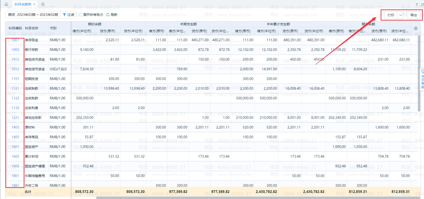 2、再点击右上角【打印】或是【导出】即可打印一级科目的科目余额表或导出一级科目的Excel表格,如图: