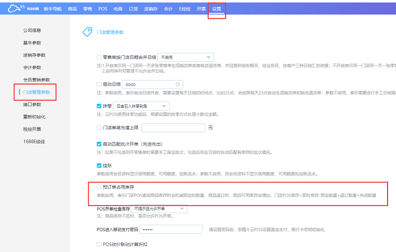 参数启用,表示门店POS查询商品库存时会扣减预定的数量,商品退订时,商品可用库存会增加,门店POS库存=即时库存-预定数量+退订数量+关闭数量