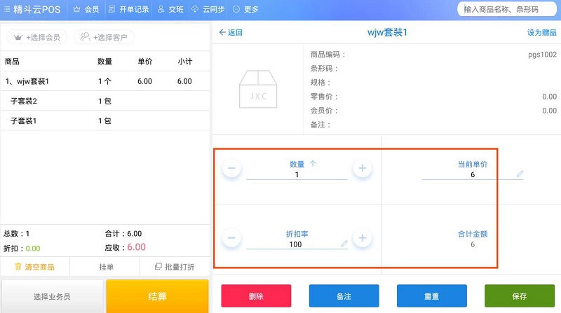 2) 选择套装商品开单后,仅套装能编辑数量及打折改价