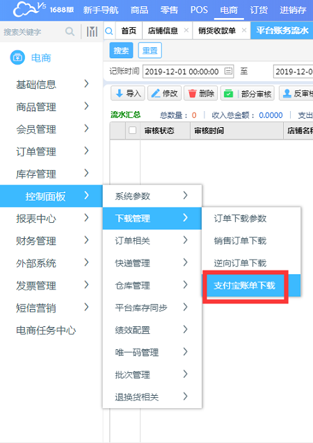 2、在电商模块--打开控制版面-下载管理-支付宝账单下载界面,