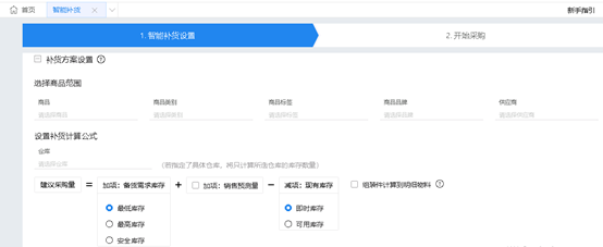 企业为了避免出现断货的情况,需要提前补充库存。不同行业、不同企业对于备货量的需求是不一样的。本系统提供补货方案的设置,企业可以根据自己的需要,设置不同的公式来计算建议采购量。