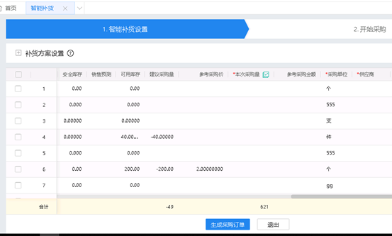 选择要补货的商品点击“生成采购订单”,将供应商,业务员,商品,采购单位,本次采购量,参考采购价,预计交货日期,备注带入采购订单中,生成的采购订单为保存状态,可以修改。