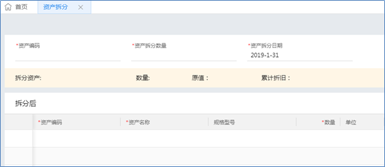 入口一:【资产管理】→【资产拆分】,可打开一张新的资产拆分单界面,如下图: