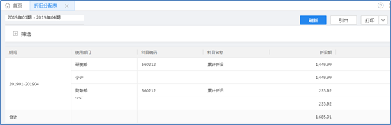2、单击【资产管理】→【报表】→【折旧分配表】,进入“折旧分配表”页面。如下图所示:
