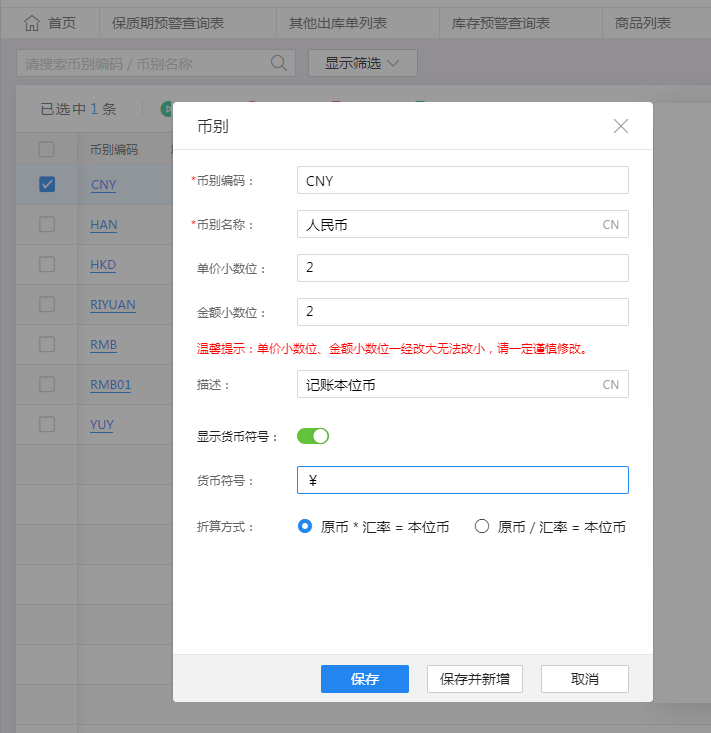 依次点击【基础资料】-【币别】,点右上角新增,输入“币别编码”“币别名称”,设置好单价小数位,金额小数位、汇率类型、汇率、折算方式等信息保存即可。