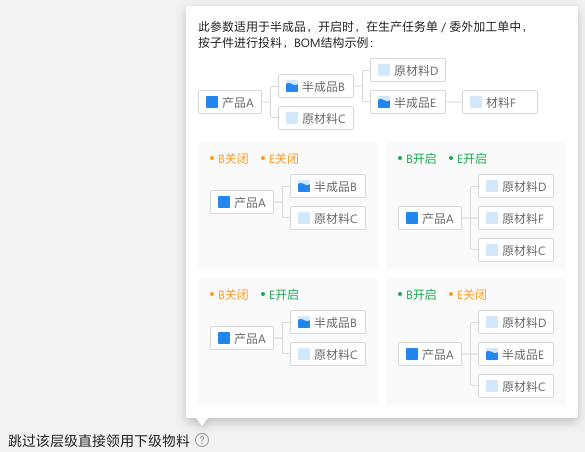 在BOM单上有个参数叫”跳过该层级直接领用下级物料“,也称”BOM跳层“,当启用了该参数时,下达产成品的生产任务单可直接领用零部件的下级物料,同时物料需求建议也可直接计算零部件的下级物料。