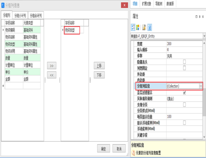 根据单据中单据体的物料,有时候需要进行分组显示,比如A类物料为一组,B类物料为一组,再对其中的分组进行合计显示数量统计,这时会需要用到分组列信息使用。