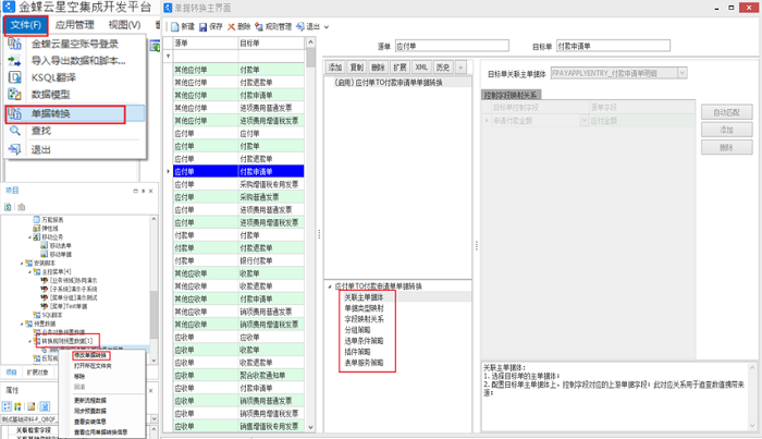 单据转换是为了解决单据之间的数据转换的问题,通过参数配置的方式,让这种转换规则不再是一种固化的规则,而是可以灵活调配的。通过规则实现数据映射、过滤、分组合并、计算等配置,以满足单据转换过程中的业务需要。