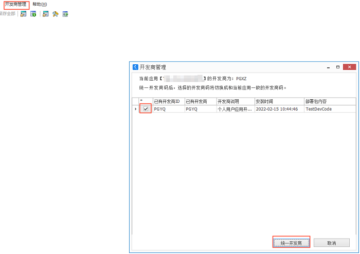 【开发商管理】 -> 【统一开发商码】-> 勾选需要切换的开发商码,然后统一开发商码即可。