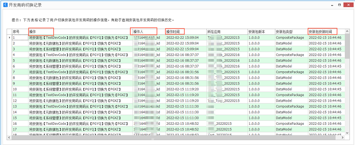这里即显示出该数据中心中所有的切换开发商码的历史信息。