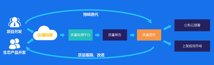基于金蝶云星空协同开发云的在线构建,质量监测平台将自动对开发成果进行质量检测以及构建制品,并输出质量报告,开发者可以根据质量报告,了解制品质量问题、改进方案,在持续迭代过程中不断提升质量。同时,质量报告也是制品公有云部署、生态产品上架的重要依据。