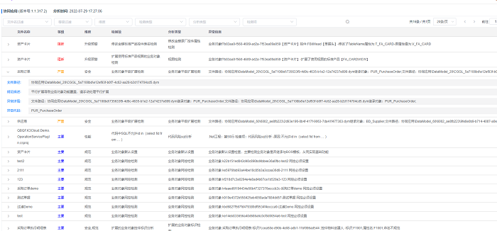 点击应用分析报告,进入应用的风险提示分析界面,这里会显示该应用上定制化开发的成果一些需要注意的地方,例如:命名不规范,出现了平行扩展之类的,或者应用构建包安装到服务器上,对数据中心以及服务器上可能会出现的一些风险项,和对于升级产品版本,可能出现的一些风险项。