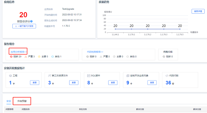 从这里我们可以看到我们的开发成果的升级风险,可以根据检测结果进行修改开发成果。