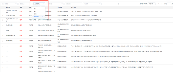 在线构建完成后,对定制开发内容进行分析,让客户提前感知当前定制开发成果与金蝶最新标准产品是否存在冲突,防止升级到金蝶最新标准产品后,存在质量问题。