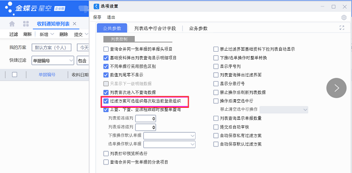 3、检查此用户在此功能菜单的用户参数设置,发现在选项设置里面勾选了“过滤方案可选组织每次取当前登录组织”,如截图:
