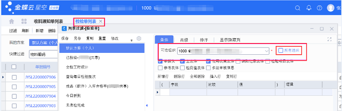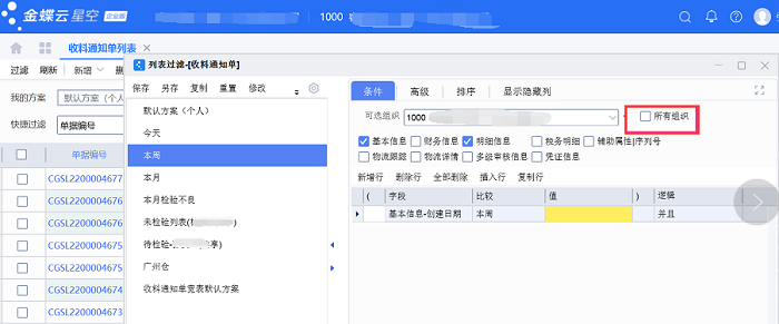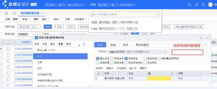 问题描述:企业启用了多组织,某个用户已经授权了多个组织的权限,在某个功能菜单单据列表的过滤条件中想勾选所有组织时,发现没有这个复选框,如截图:收料通知单列表