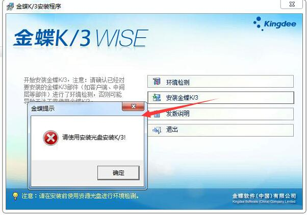 安装K3时弹出窗口“金蝶提示:请使用安装光盘安装K3!”
