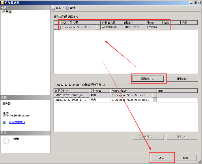 2)单击【添加】按钮,选择一个待附加的数据库,单击【确定】-【确定】等待附加完成即可。