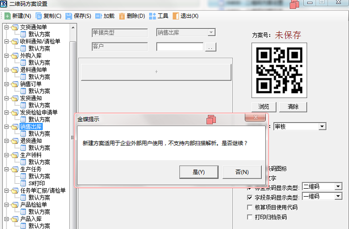 另一种是专门供外部扫描识别用,如:销售订单、销售出库单新增二维码方案打印的二维码,这种码不会显示数据库内码信息,普通用户易识别,但是这种类型的码不能用于WMS内部扫码用,仅供外部查看。