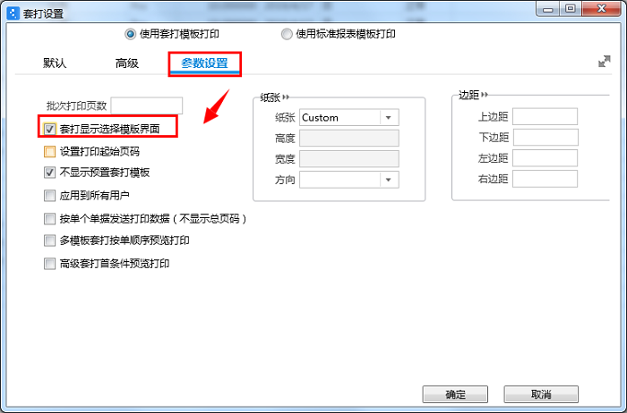 用户在【套打设置】-【参数设置】中勾选【套打显示选择模版界面】的参数后,在点击打印或者预览时会弹出选择打印模版的界面,此时会默认勾选标准产品的套打模板,希望默认不要勾选套打模板。