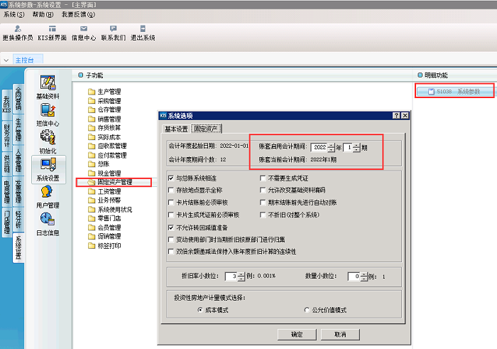 在没有录入任何卡片数据前,打开旗舰版主界面,点击【系统设置】—【系统设置】—【固定资产管理】,双击打开系统参数,修改固定资产页签的账套启用会计期间。