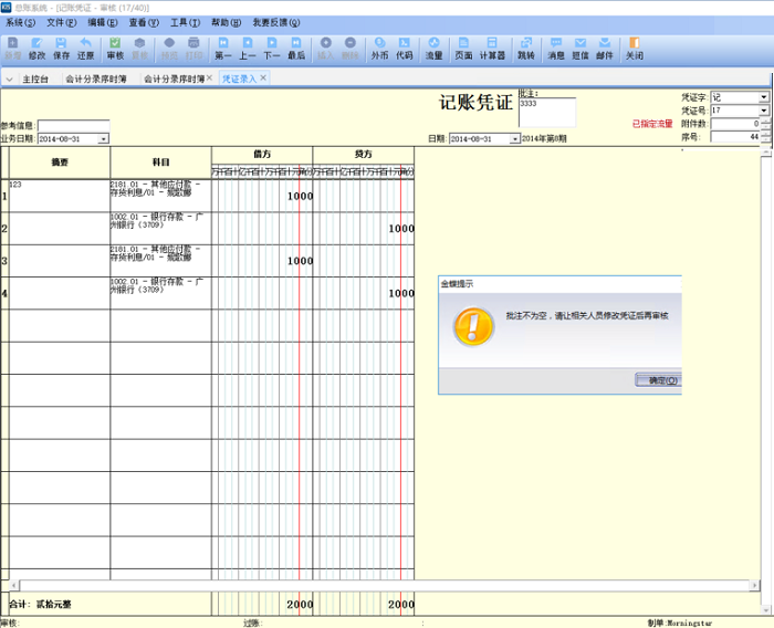 录入批注后,表明凭证有错,此时不允许审核,审核会提示:“批注不为空,请让相关人员修改凭证后再审核”,这时要清空批注或者将凭证完成修改并保存,凭证修改后,批注内容会自动清空。