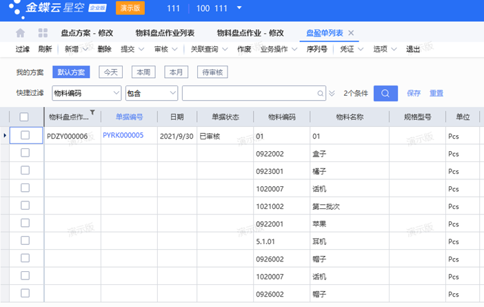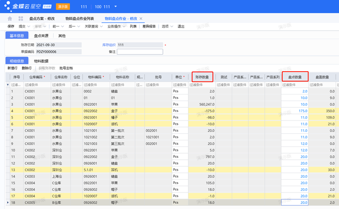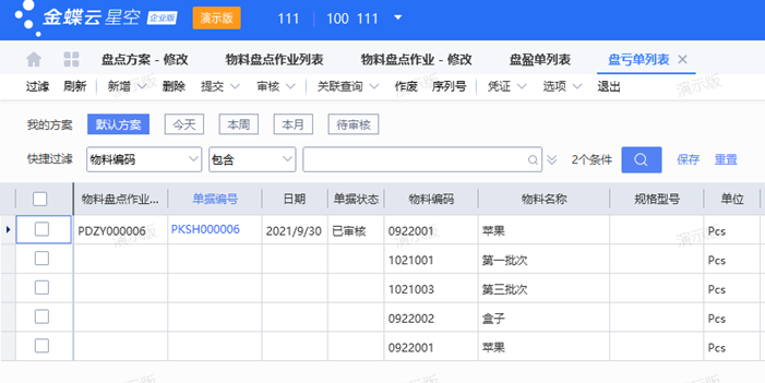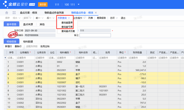 2、盘点方案维护后进行审核,自动生成“物料盘点作业列表”,仓管员可以将实际盘点数量 录入“盘点数量”字段,审核盘点作业表,系统根据账存和实存差异,自动生成盘盈或盘亏单;