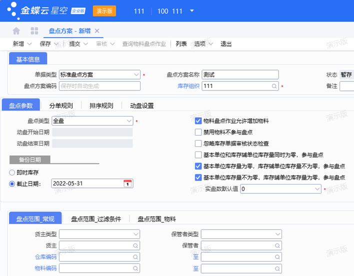 使用有权限的账号登录金蝶云星空,点击[供应链]→[库存管理]→[盘点方案],新增盘点方案,备份日期可以选择按即时库存盘点也支持按照截止日期盘点,在盘点范围中可以选择需要盘点的物料、仓库等范围,不设置盘点范围则默认盘点全部物料;
