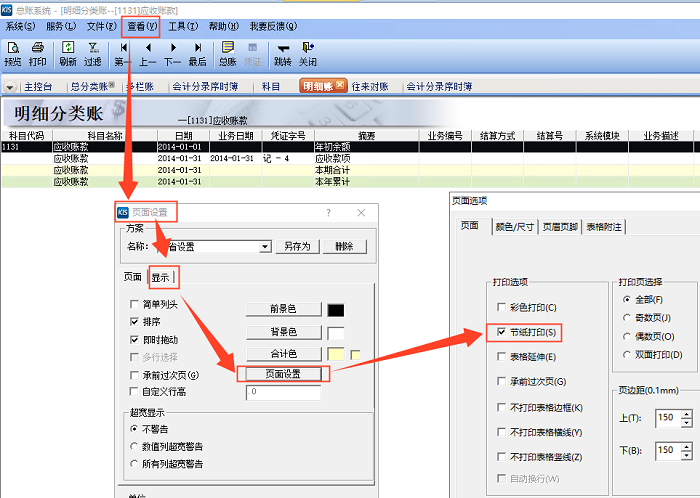 3、选择过滤条件,将需要打印的明细账过滤出来,依次单击【查看】→【页面设置】;