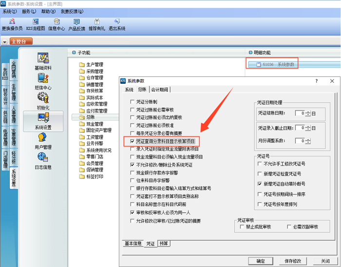 3、在系统参数窗口中,上方单击【总账】页签,下方单击【凭证】页签,勾选【凭证查询分录科目显示核算项目】即可。