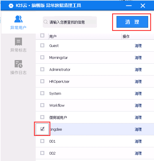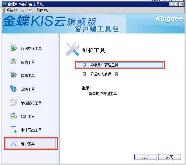 打开客户端工具包,找到维护工具,打开异常用户清理工具,登录对应的账套,勾选对应的用户,点击清理。
