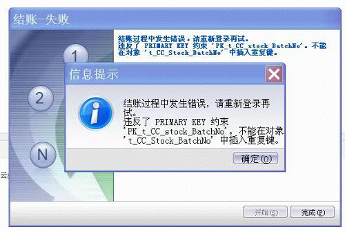 商贸版业务结账提示:结账过程中发生错误,请重新登录再试。违反了 PRIMARY KEY 约束 'PK_t_CC_stock_BatchNo'。不能在对象 't_CC_Stock_BatchNo' 中插入重复键。