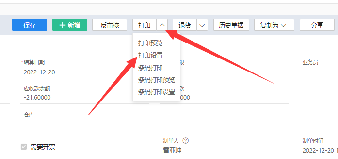 1、打开单据界面,点击打印按钮右边的﹀下来选择打印设置