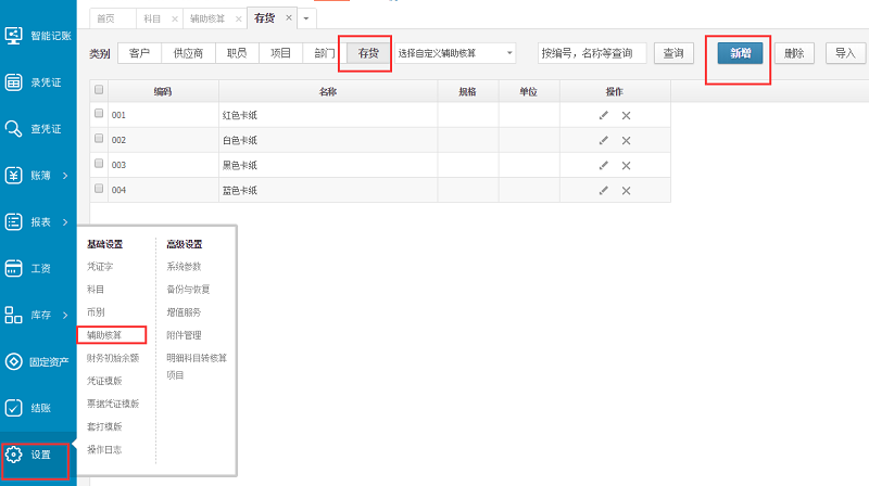 第二步:在【辅助核算】 -- 【存货】中添加存货明细