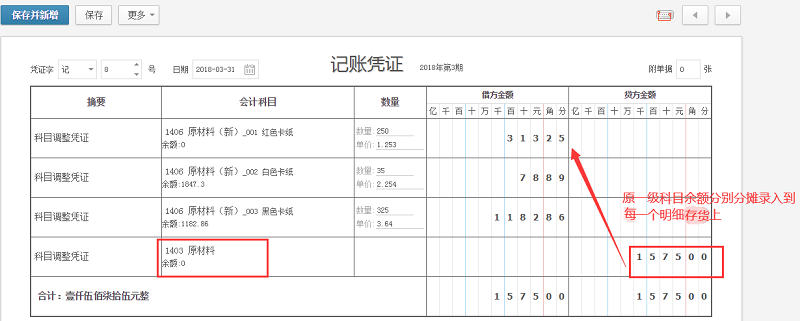 第三步:做一张结转凭证,把【原材料】数据手工录入凭证调整至新科目【原材料(新)】中即可