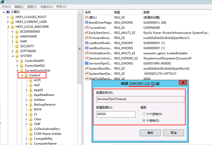 2)进入注册表,展开到HKEY_LOCAL_MACHINE-SYSTEM-CurrentControlSet-Control注册表,选中“control”后,在右侧空白处新增一个DWORD,名称为“ServicesPipeTimeout”,然后右键选择[修改],选择十进制,值为90000或120000,保存后,重启计算机;
