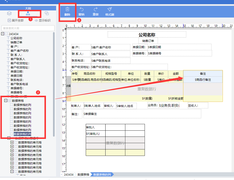 设置套打模板需要删除一列,先选择【大纲】,选择具体需要删除的【数据表格的列】,再点击左上角“删除”即可。