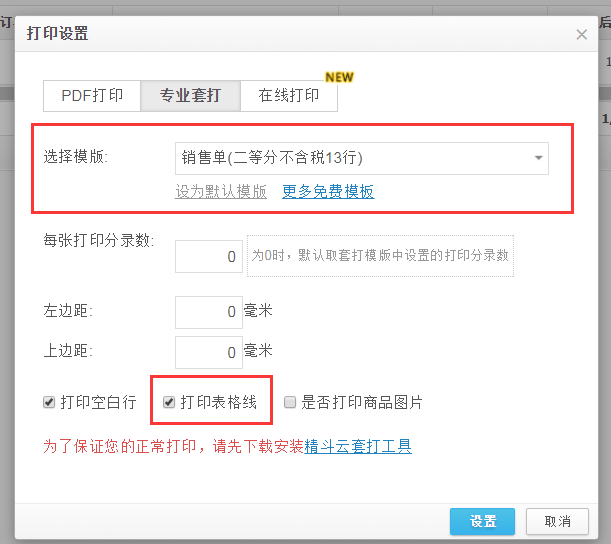 1、检查打印设置里面的套打打印是否设置了模板,打印表格线,若没有,请勾选