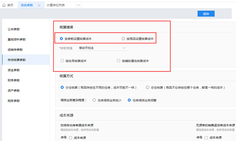 商品成本核算方式在系统参数中设置:依次点击[系统设置]-[系统参数]-[存货核算参数]-[核算维度],可选择两种核算方式: