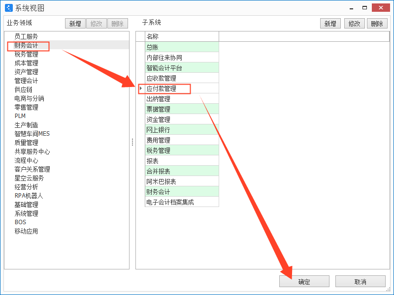 2、在【系统视图】页面点击【财务会计】→【应付款管理】→确定;