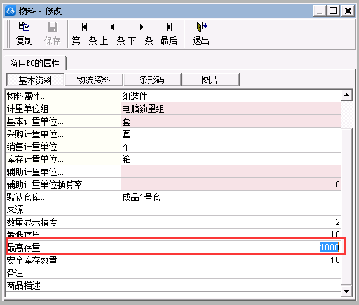 3、双击左侧需要设置修改的物料名称,弹出[物料-修改]窗口,在[基本资料]页签中的[最高存量]文本栏填入数据即可。