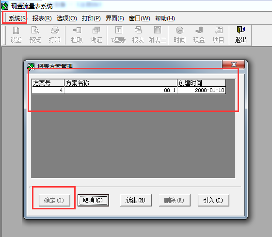 单击菜单[系统]-[报表方案],选择报表方案名后单击[确定]按钮进行报表方案,此时现金流量表系统界面上的功能按钮都是黑色的,可以正常使用。