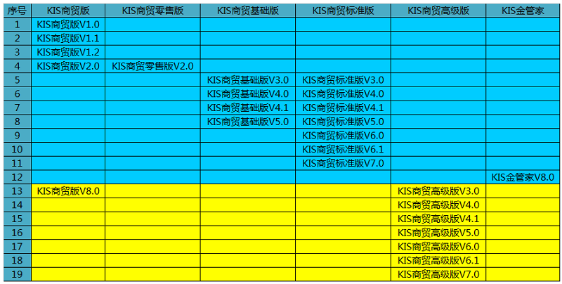  蓝色背景表格中的版本使用当前版本“金蝶KIS云·商贸版迁移工具”来进行升级。