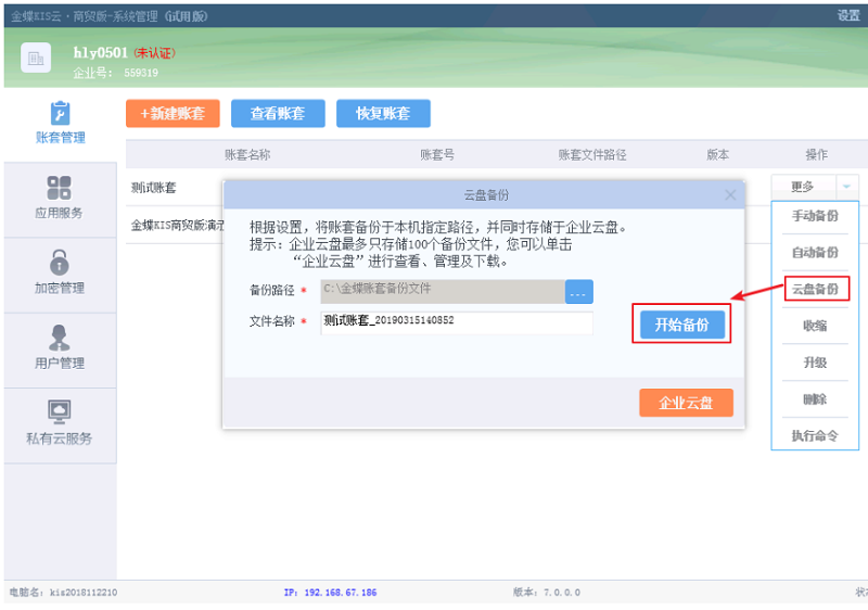 在金蝶KIS云·商贸版V9.0的私有云环境,【系统管理】→【账套管理】→【更多】→【云盘备份】,将账套上传到企业云盘。